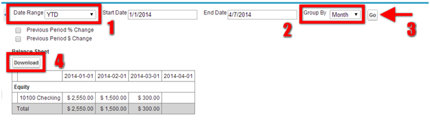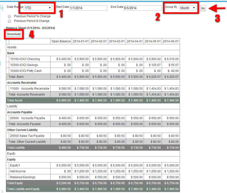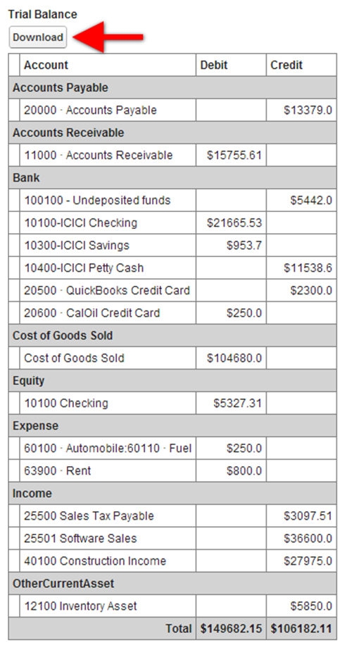 Click on the trial balance link in the in the AccountingBook Tab in the Home Page, the Trial Balance page gets opened. You can download the report and save it for future references from the Download button provided