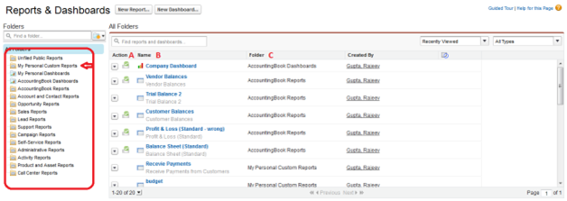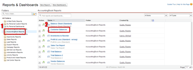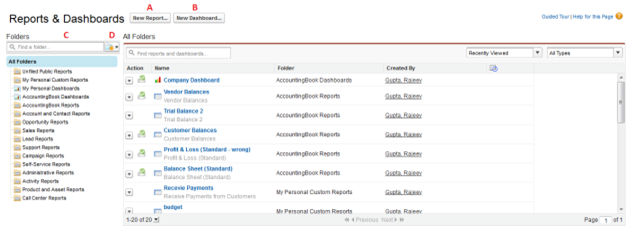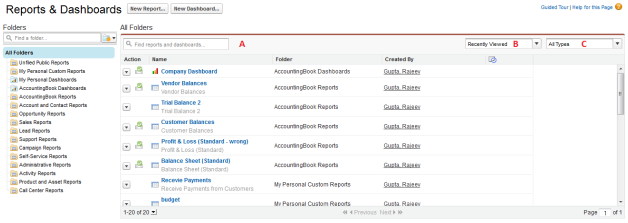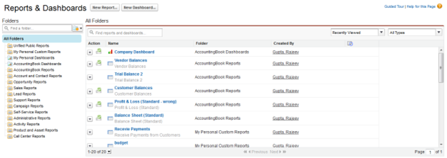 SalesForce for AccountingBook delivers standard report folders containing reports for each record type such as Leads, Accounts and Opportunities. These reports are used as the starting point for your organization's reporting efforts.