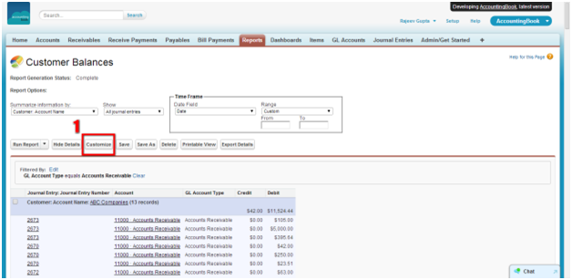 Click a standard report title to run a Report. We will select the (1) AccountingBook Reports and then (2) click on Customer Balances