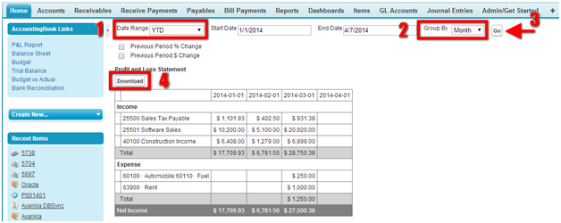 Apart from the standard reports, AccountingBook supports financial reports of the business entities or individuals. You can access the financial reports in the home page under AccountingBook links on the top-left hand side of the computer screen