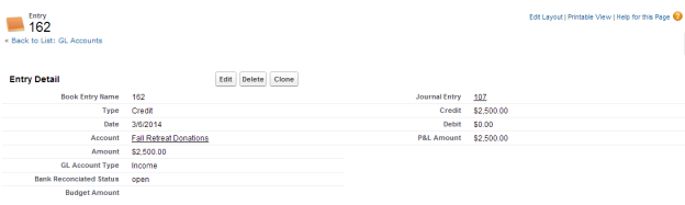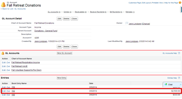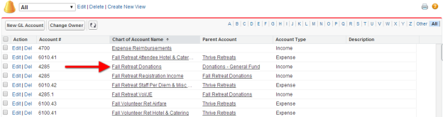 Click on the Fall Retreat Donation under the Chart of Account Name, you will notice that the amount