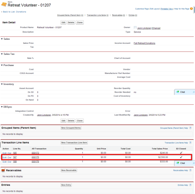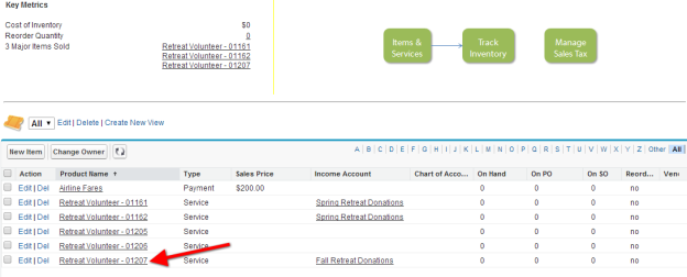 8. In the Items Object click on Retreat Volunteer – 01207 in the Product Name