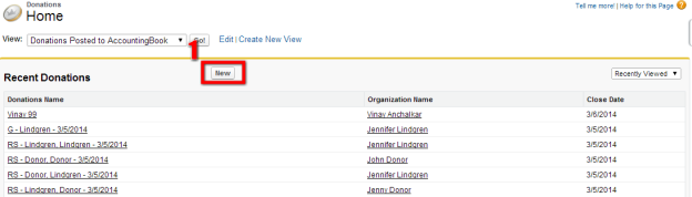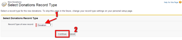 - Select Donation in the Record Type of new record and Click on Continue Button
