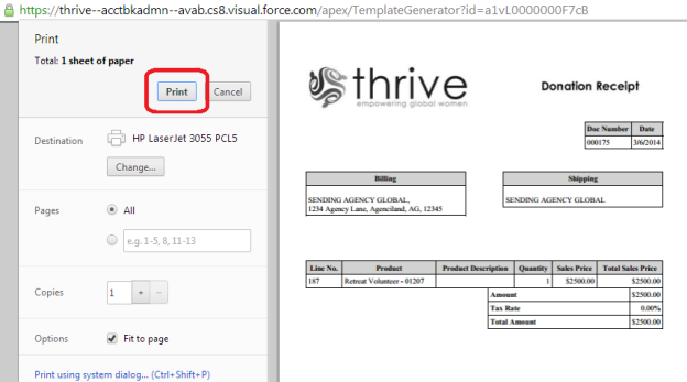 7. On clicking the PDF button a new page is opened from where you will be able to print the Donation Receipt. To print press on Control+P buttons on your key board, adjust the printer setup and click on the Print button.