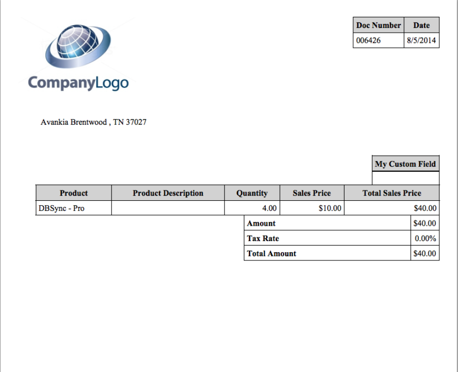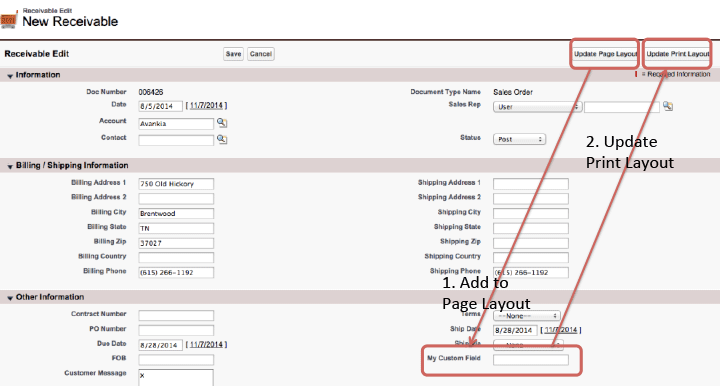 - Save, and go back to the Receivable Object and click on "Print PDF". You can see the new custom field display in the printable view.