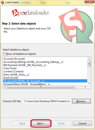 If you are setting up AccountingBook instance in sandbox or in SalesForce you need to have CSV files of the required data to be imported to the AccountingBook. Open Data Loader package and click on the Insert button.
