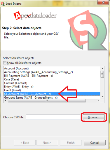 As we are setting up the AccountingBook, the first thing we need to setup is GL Accounts or the Chart of Accounts, select GL Accounts from the SalesForce object from the given list. Browse the CSV file of Chart of Accounts which needs to be uploaded to the AccountingBook.