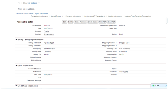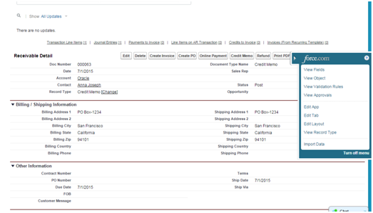 - Open any Receivable Record and click on view fields through Force.com Quick Access Menu