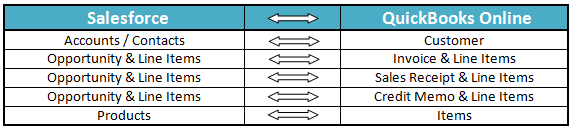 Data flow of Bi-directional integration between Salesforce & QuickBooks Online is shown in the below table.