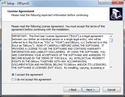- Click on Next on the "Welcome to the DBSync Setup Wizard" window.