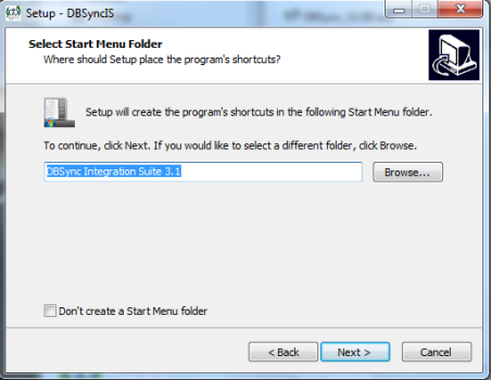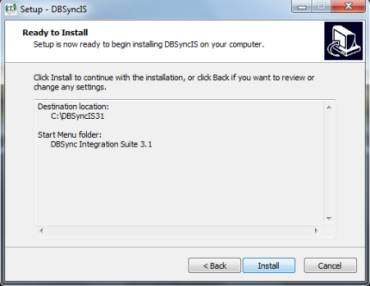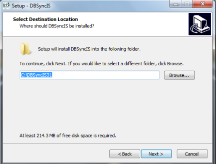 - The default windows path for DBSync installation is C:\ DBSyncIS31. If you want to use a different folder, click on the Browse button and select the desired location to install DBSync.