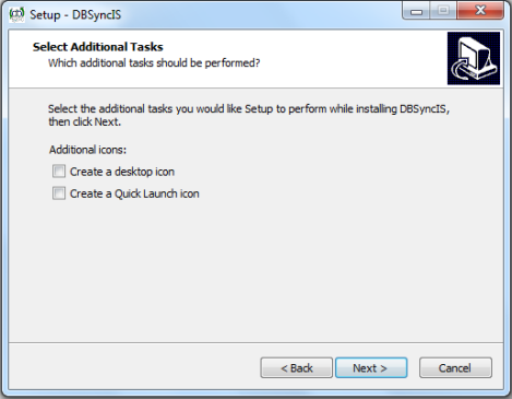 - On the next window, select the check-boxes for Create Desktop Icon and Create a Quick Launch icon if you wish to have DBSync shortcuts on your desktop and click on Next button.