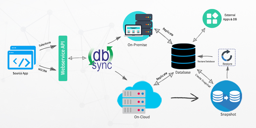 DBSync Replication is offering you to connect the source apps like Salesforce and Microsoft CRM with different database like MySql, SQL Server, Oracle, DB2, PostgreSQL, Cassandra, Redshift, Sybase and MongoDB.