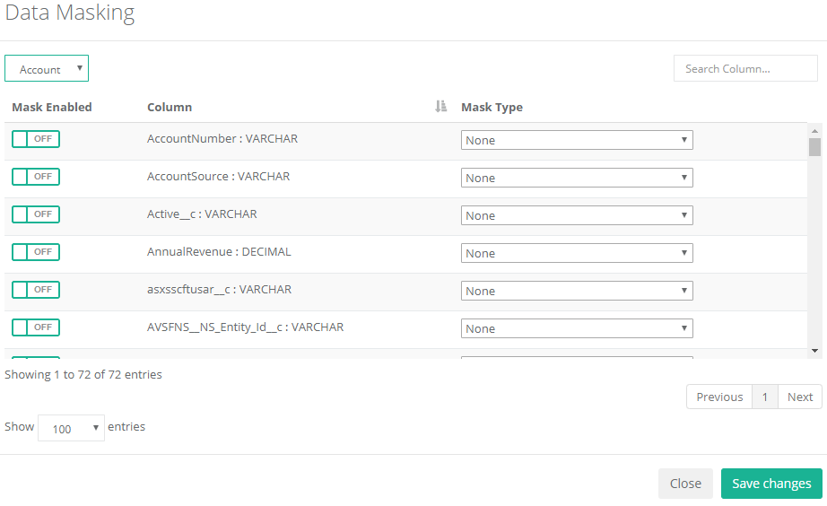 17. As you can see on the above image Account object is showing on the top left corner and other options like Mask Enabled (Toggle buttons), Column, and Mask Type.