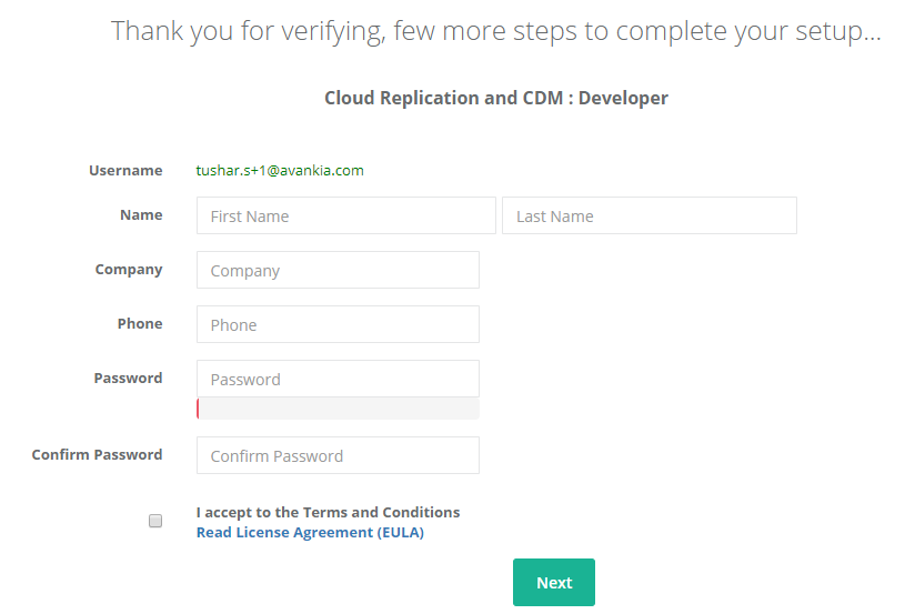 8. Next, enter the required field details like "username, name, company, phone, password and confirm password". Select the checkbox to accept the terms and conditions and then click on next button.