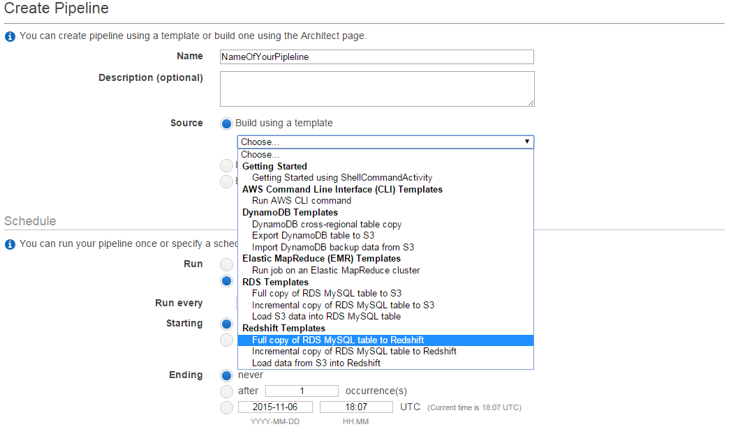 • In your amazone console goto Analytics and select datapipeline. As per your requirement you can select the template from the "source" button in my case i need move data from my MySQL RDS to RedShift. Also based on your requirements you will be able to create deploy your custom templates for deploying datapipeline.