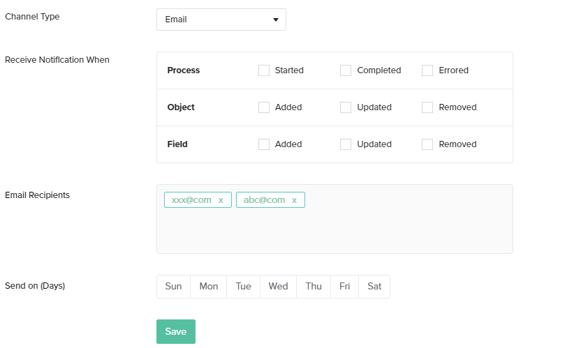 Removed- Click the checkbox next to the icon 'Removed' if you wish to be notified when an object field is removed/deleted from your Source or Database. For eg: If you enable this option you will be notified when an object (Account) field ( 'Billing Street'),(Billing City), etc is removed or deleted from your Salesforce or your Database instance.