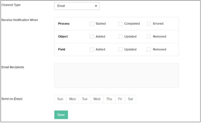 - Select 'Email' as the channel type and the settings will appear on the screen as seen in the below image: