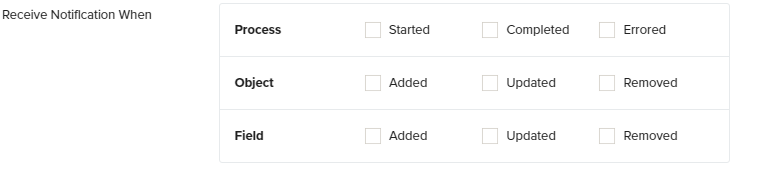 Added- Click the check-box next to the icon 'Added' if you wish to be notified when any new object field is detected in your Source or Database. For eg: If you enable this option you will be notified when any new object (Account) field ( 'Billing Street'),(Billing City) etc is detected on your Salesforce or your Database instance.