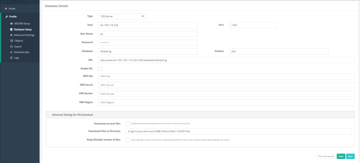 - In Database details tab Download Attachments/Document/Contentversion as local files must be checked and saved to enable file replication process.