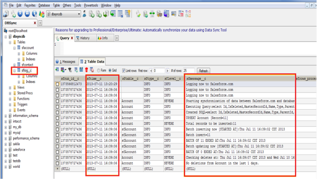 Figure:9 - If Database Logging is enabled, SFLOG_C table will be auto created in the database which will have useful details like timestamp and the log details as shown below.