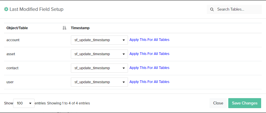 - For Each of the selected Objects, It Shows the default selected Timestamp field