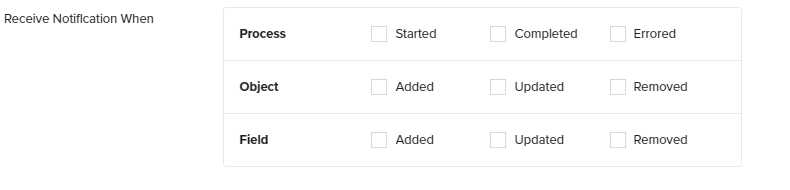 Removed- Click the checkbox next to the icon 'Removed' if you wish to be notified when an object is removed/deleted from your Source or Database. For eg: If you enable this option you will be notified when an object such as 'Account', 'User' etc is removed or deleted from your Salesforce or your Database instance.