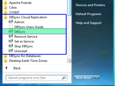 - Windows Start > Programs > DBSync Cloud Replication > DBSync