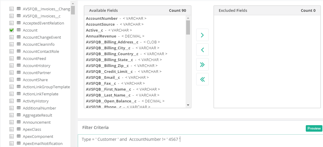 - Select the object fields you want to sync into the database from the"Available Fields" section and use the "exclude fields" section to filter out fields you don't want to sync into database.