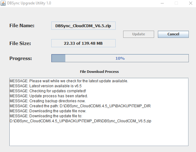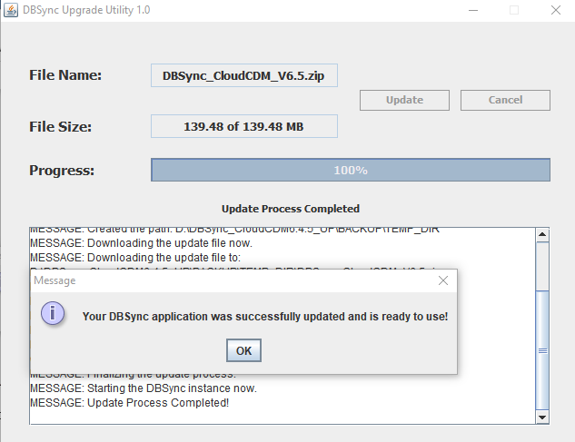- Click on the update button it will show a message "DBSync application will be started automatically once if the update is successfully completed".