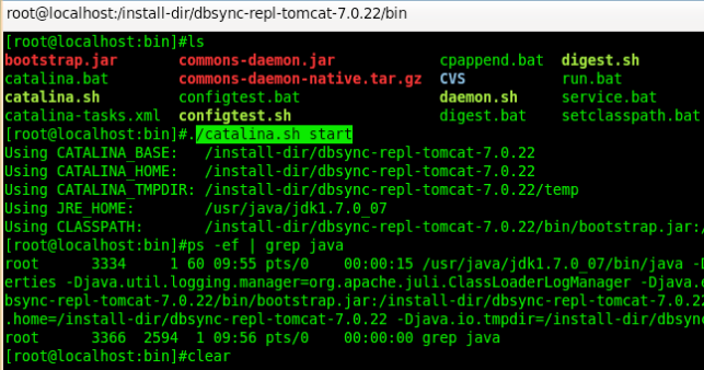 - At this point the DBSync Cloud Replication tool is installed on your Linux server. You can start the DBSync Cloud Replication tool by navigating to the bin folder and running the command from the terminal window ./catalina.sh start.