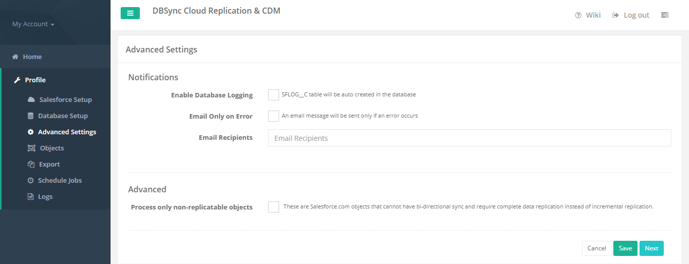 - Click to "advanced" settings tab on the left hand corner in the Profiles section of DBSync replication portal.