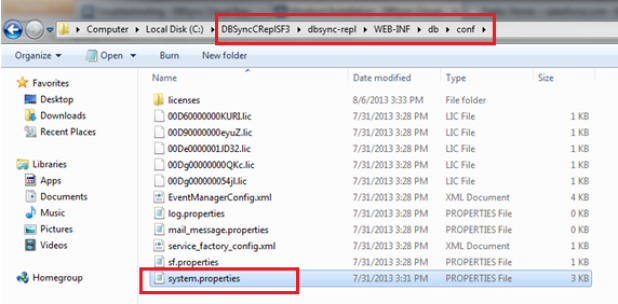 - System Properties must be accessed from the installation folder DBSyncCReplSF3. The following path can be referred dbsync-repl > WEB-INF > db > conf > system.properties
