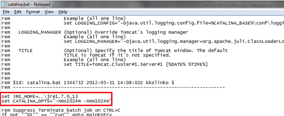 • If set CATALINA_OPTS command is not found, include the new command to edit the default values for Xms & Xmx. The new command must be CATALINA_OPTS="-Xms1024m --Xmx1024m" and must be placed after the command set JRE_HOME=..\jre1.7.0_13