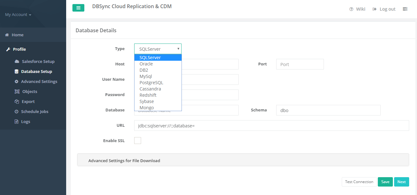 1. Click to "advanced" settings tab on the left hand corner in the Profiles section of DBSync replication portal.