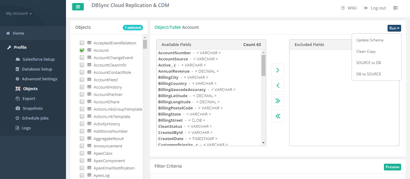 Step 2: In DBSync Cloud Replication, under ‘Sales Sync Object Details’ Tab, select ‘Account’. Move Billing Street and Billing City fields from Available Fields to Exclude Fields using -> button. Save the selection and run the Replication Source to DB.