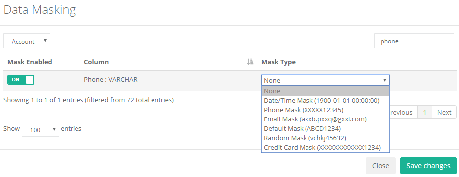 - Here, I have selected the Phone Column and enabled the mask. On the right side, you will see the drop-down menu to select the mask type.