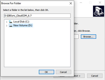 - Click on the Browse button to select the desired location where you want to install the DBSync Cloud Replication Tool and click on the Next button to proceed to the next window.