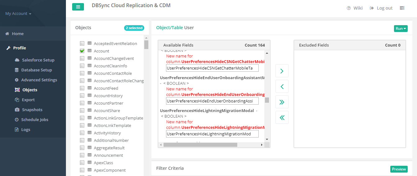 DBSync Cloud Replication allows renaming the Salesforce & MS CRM Objects & fields in Database as table & column while replicating.
