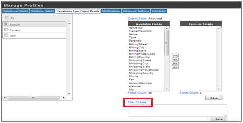 • In DBSync Cloud Replication, Filter Criteria is available under Salesforce Sync Object Details tab.