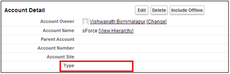 Example: Account sForce in Salesforce does not have Type which is already replicated in database. If the type is updated as ‘Customer – Channel’ in database, Salesforce must also be updated with the same. In order to update in Salesforce do_sync_flag value must be changed to ‘S’ and this must be saved before running the replication DB to Source. After successful run, Account sForce will have Type ‘Customer - Channel’.- Account sForce does not have Type in Salesforce.