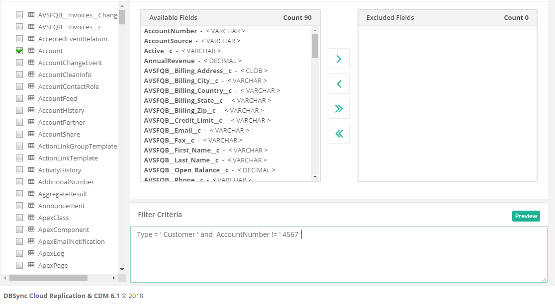 Step 2: In DBSync Cloud Replication, under ‘Sales Sync Object Details’ Tab, select ‘Account’. Move all the API names from Available Fields to Exclude Fields using >>.
