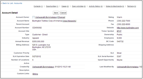 Step 1: Salesforce Account Details are as shown below. Let us replicate all the fields in the Accounts Object except Billing Street and Billing City fields.