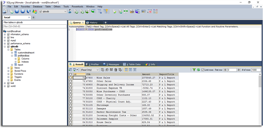 For this tutorial I selected MYSQL as the Database for writing the data that has been read from the QuickBooks Profit and Loss Report. Below is the script for you to generate the Database with tables and relevant columns .