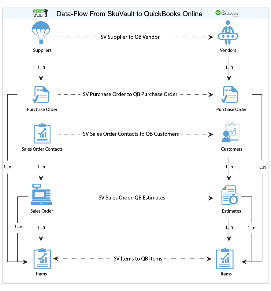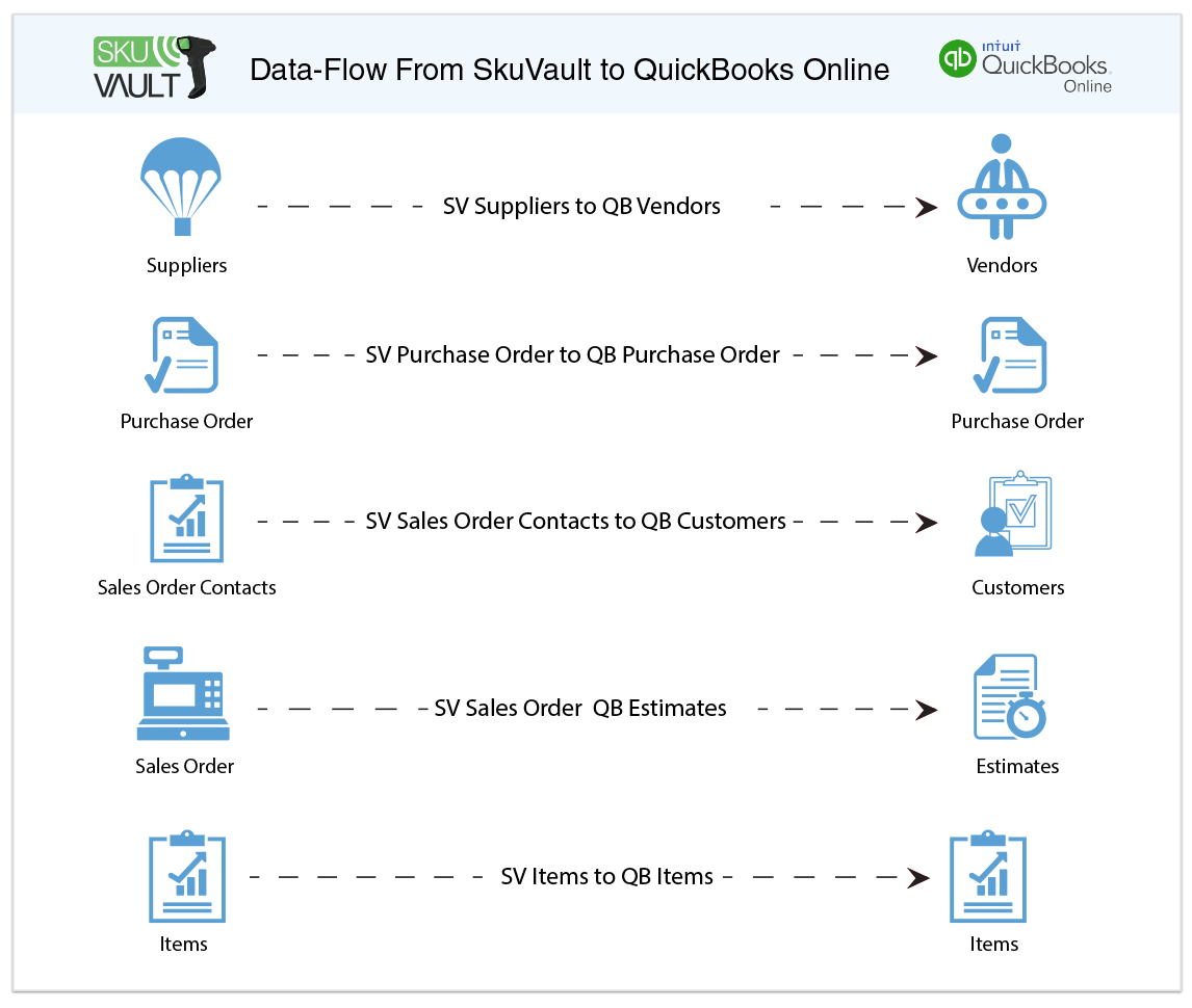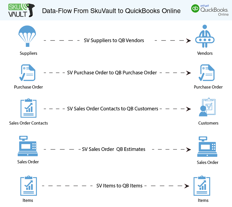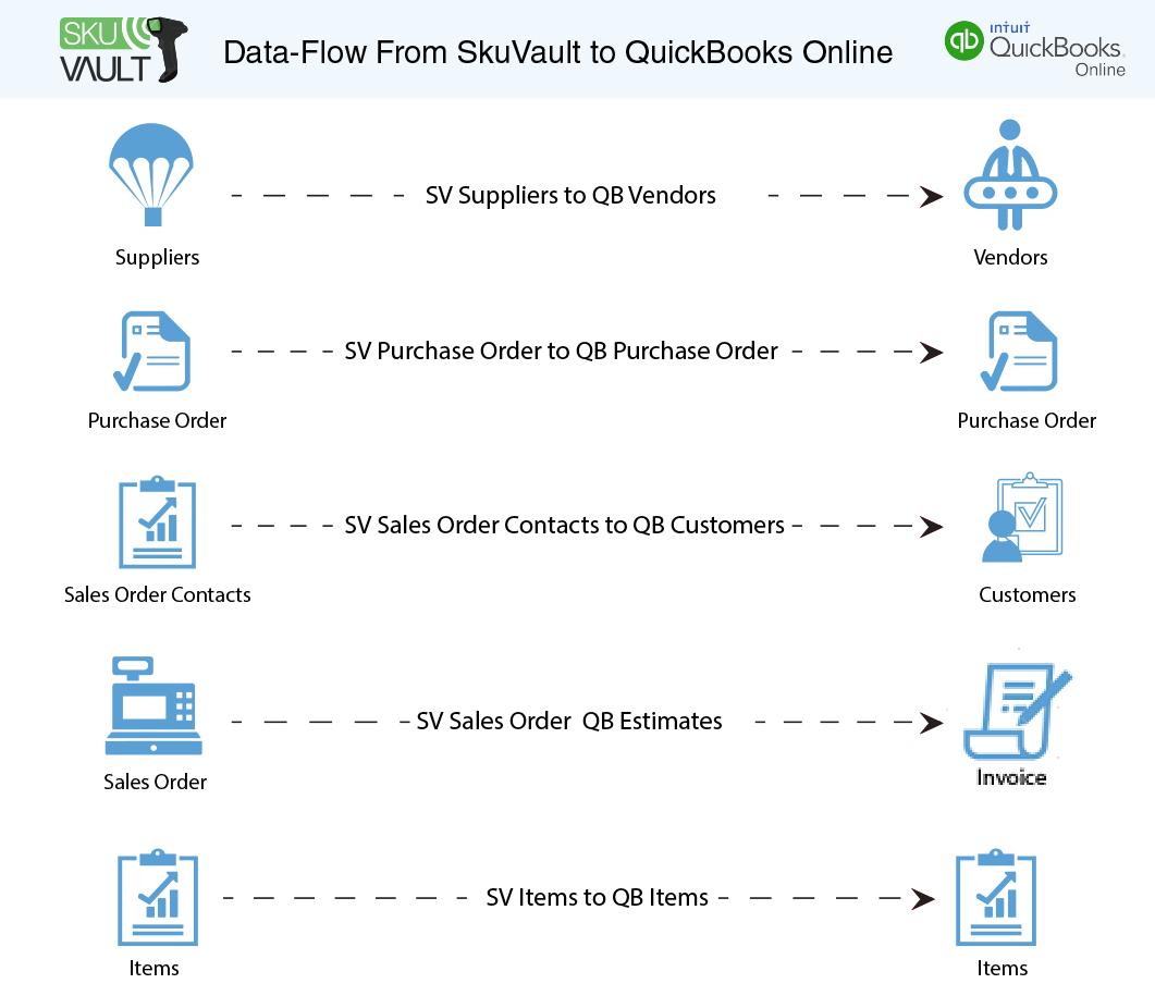 DBSync for SkuVault & QuickBooks Online is easy to use integration template. It integrates SkuVault Supplier, Item, Sales Order, Purchase Order with QuickBooks Vendors, Item, Estimate, and Purchase Order respectively. This template provides Uni-directional sync with a pre-built field-to-field mapping along with the flexibility for more complex and dynamic mapping capability.