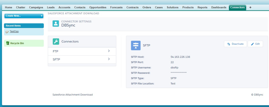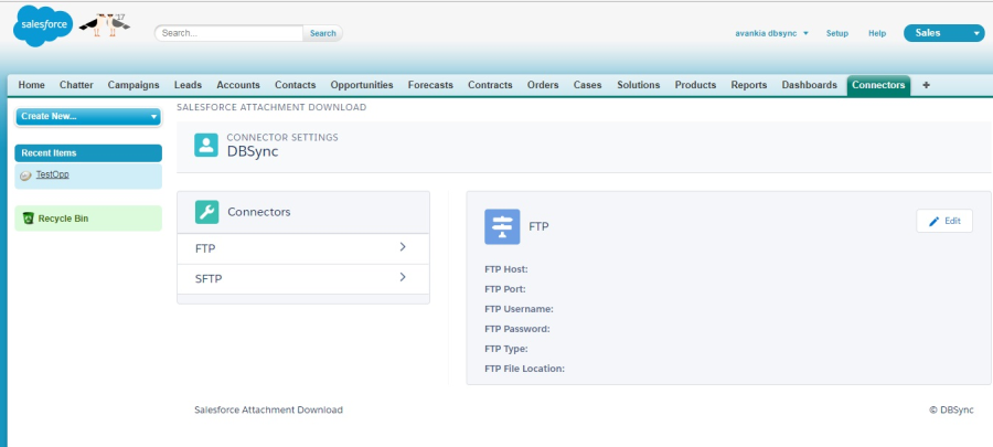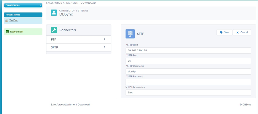DBSync's App for Salesforce & FTP allows the files to be moved from Salesforce standard objects to configured FTP, SFTP locations. A User has the flexibility to configure their FTP connection within the Salesforce connector tab. This will communicate with the App in moving the files to designated folder path. This article explains the steps in configuring connector after the SF & FTP package is installed on your Salesforce instance from the AppExchange.