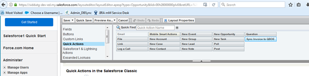 Step 3 : Edit the Page Layout of Opportunity object. Under Quick Action, search for "Sync Invoice To QBOE" button - as shown in following image. Drag the button to the "Opportunity Detail Section" and save the Layout.