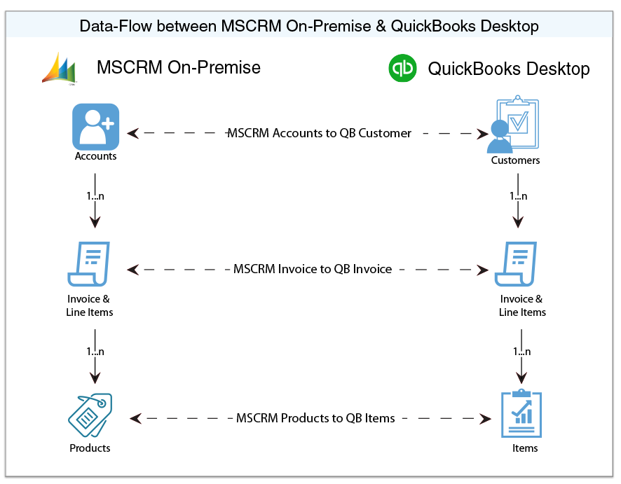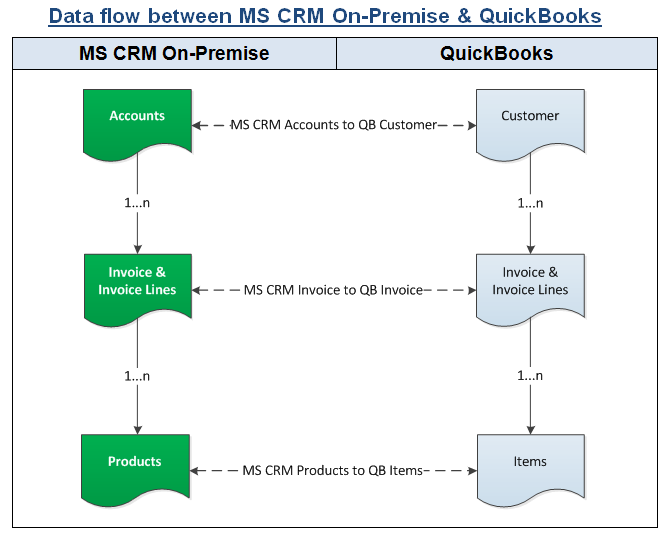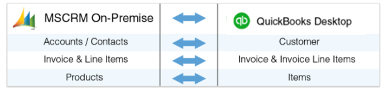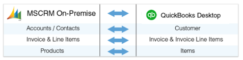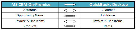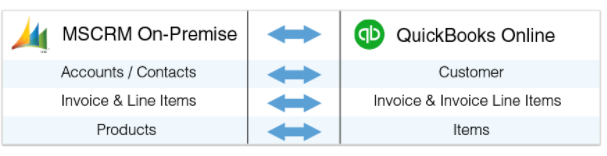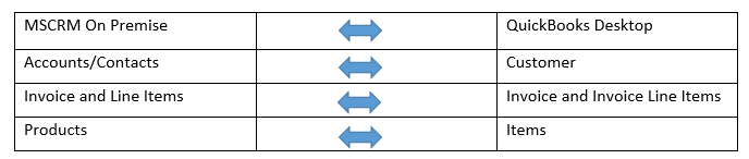 Data flow of Bi-directional integration between Microsoft Dynamics 365/CRM On-Premise & QuickBooks Desktop is shown in the table below.