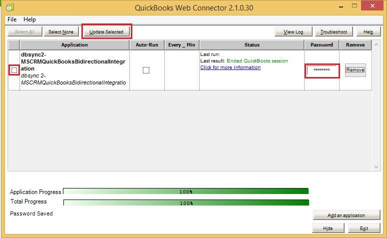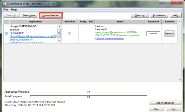 - Web connector will be launched with the selected integration Project. Select the integration Project and enter DBSync password and finally click on "Update Selected" to run the integration.