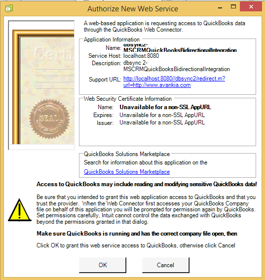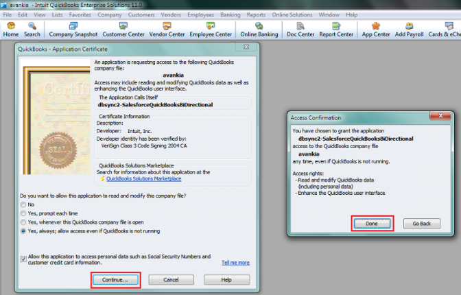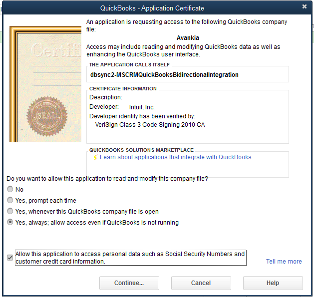 - Select the option 'Yes, always; allow access even if QuickBooks is not running' and click on continue.